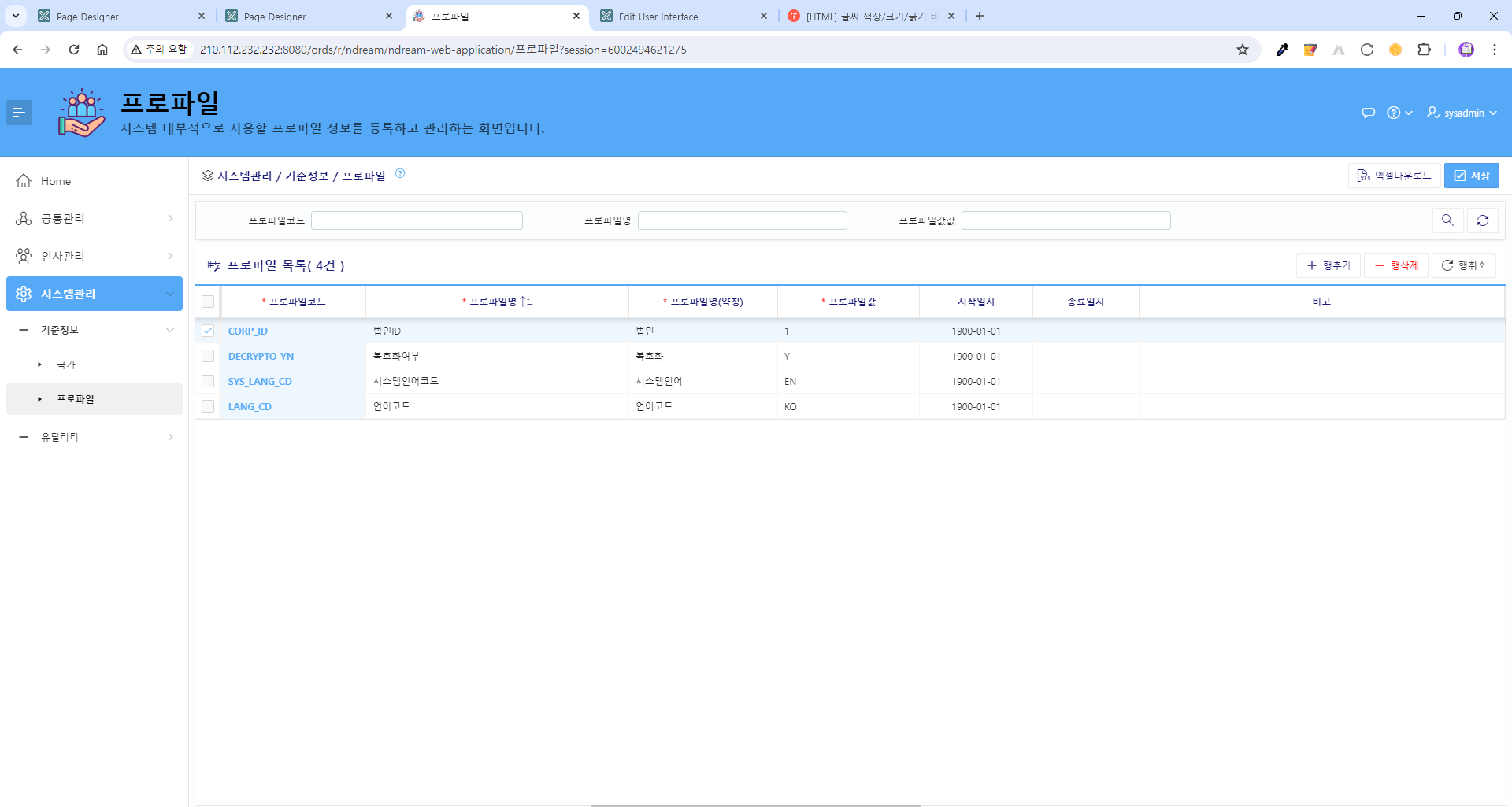 | 버튼(엑셀다운로드, 행추가, 행삭제) 색상 및 폰트, 입력항목 색상, 페이지 풋터 숨기기, 조회영역 마진 및 버튼 위치, 그리드 색상 |