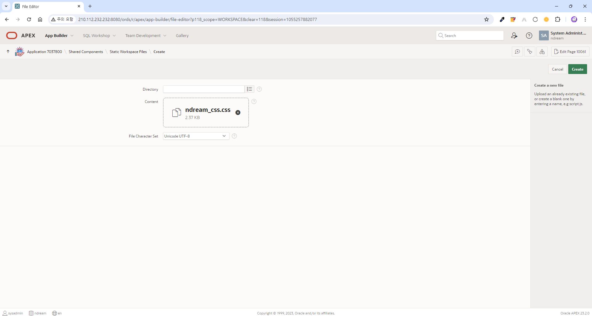 | ● Content: ndream_css.css (해당 파일을 드래그합니다.) - Create 버튼을 클릭합니다. |