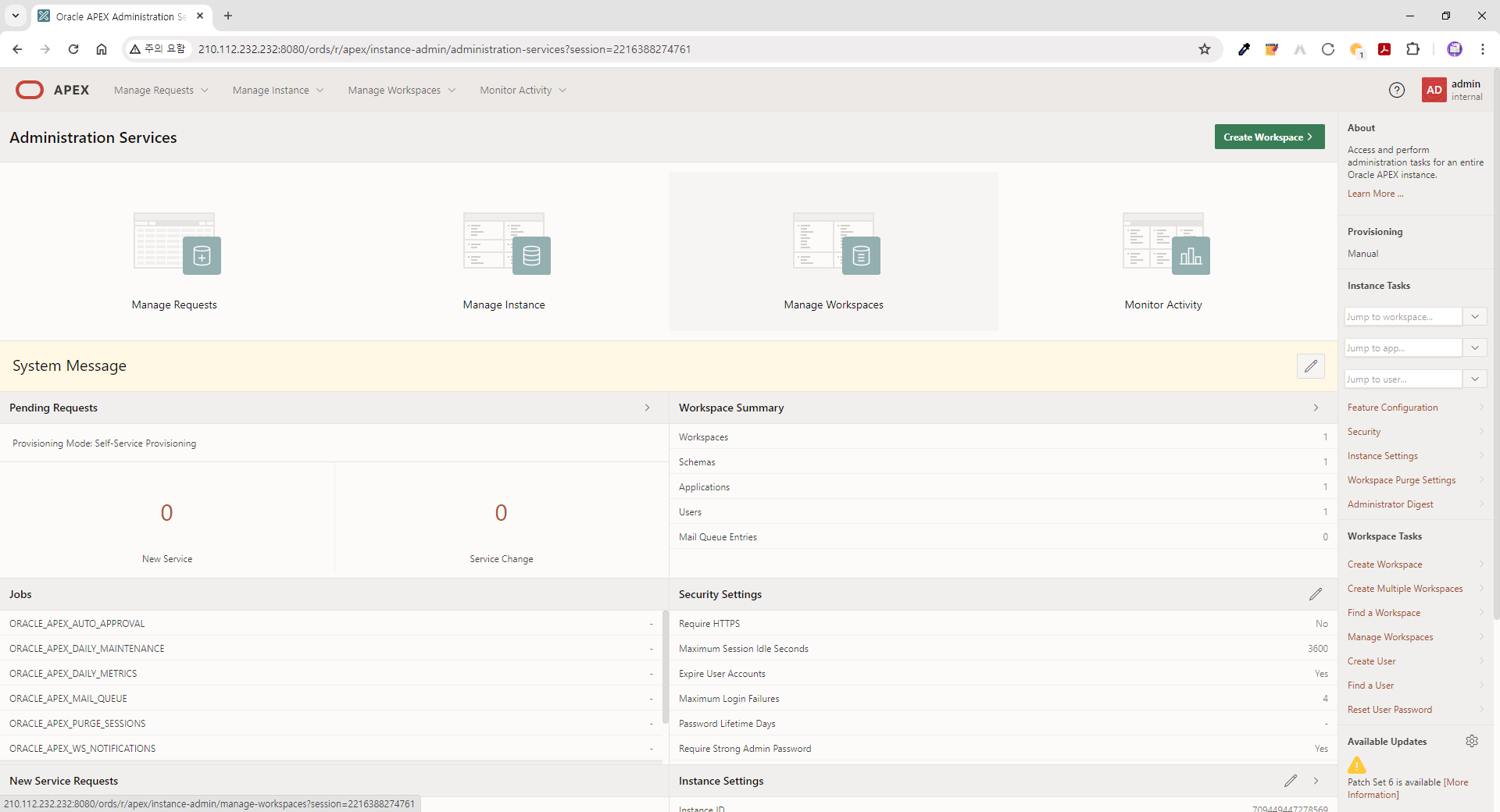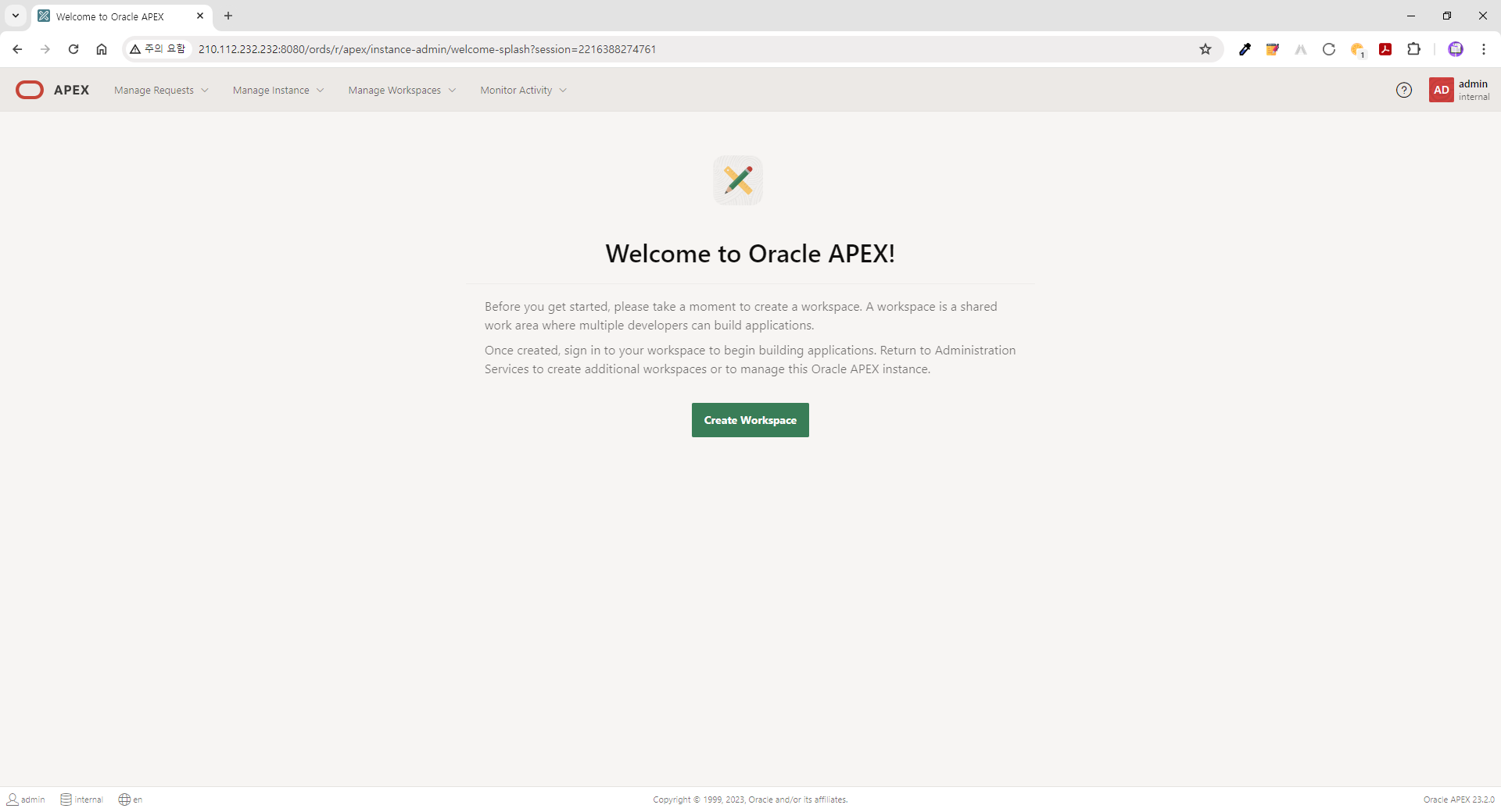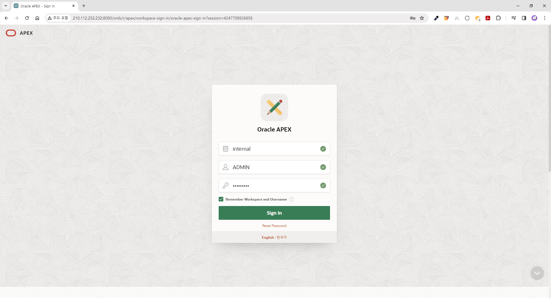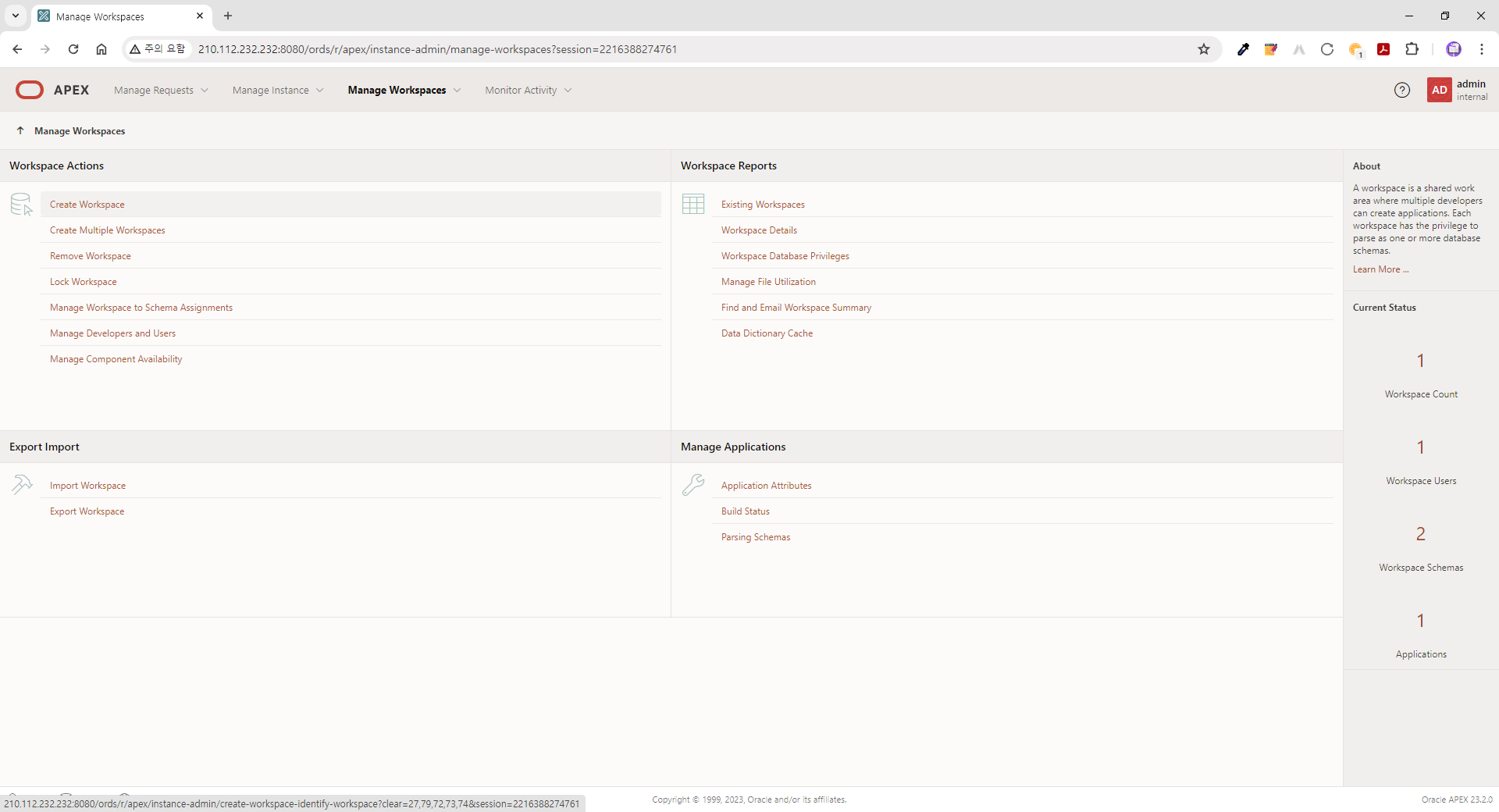 | ● 접속정보 (APEX 23.2) - URL: http://210.112.232.232:8080/ords - Workspace: internal - User Name: admin - Password: B*******$ |