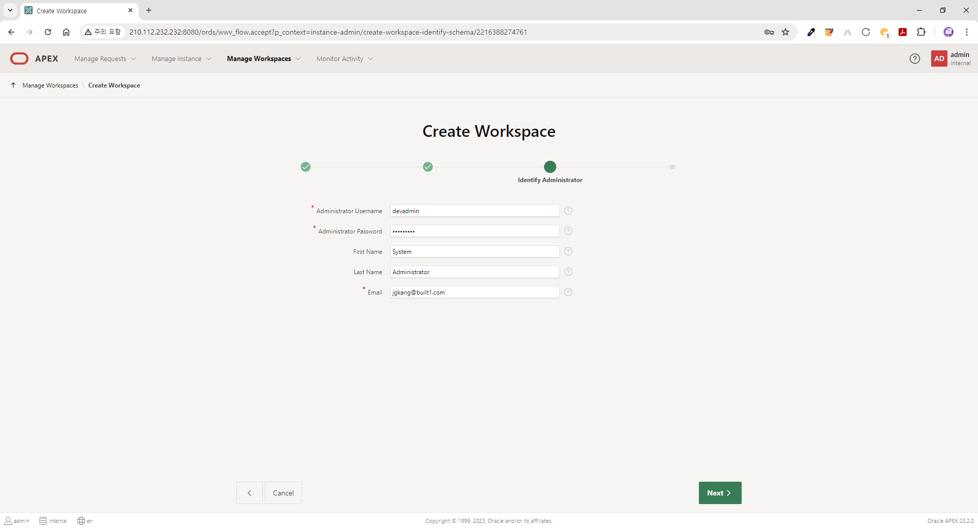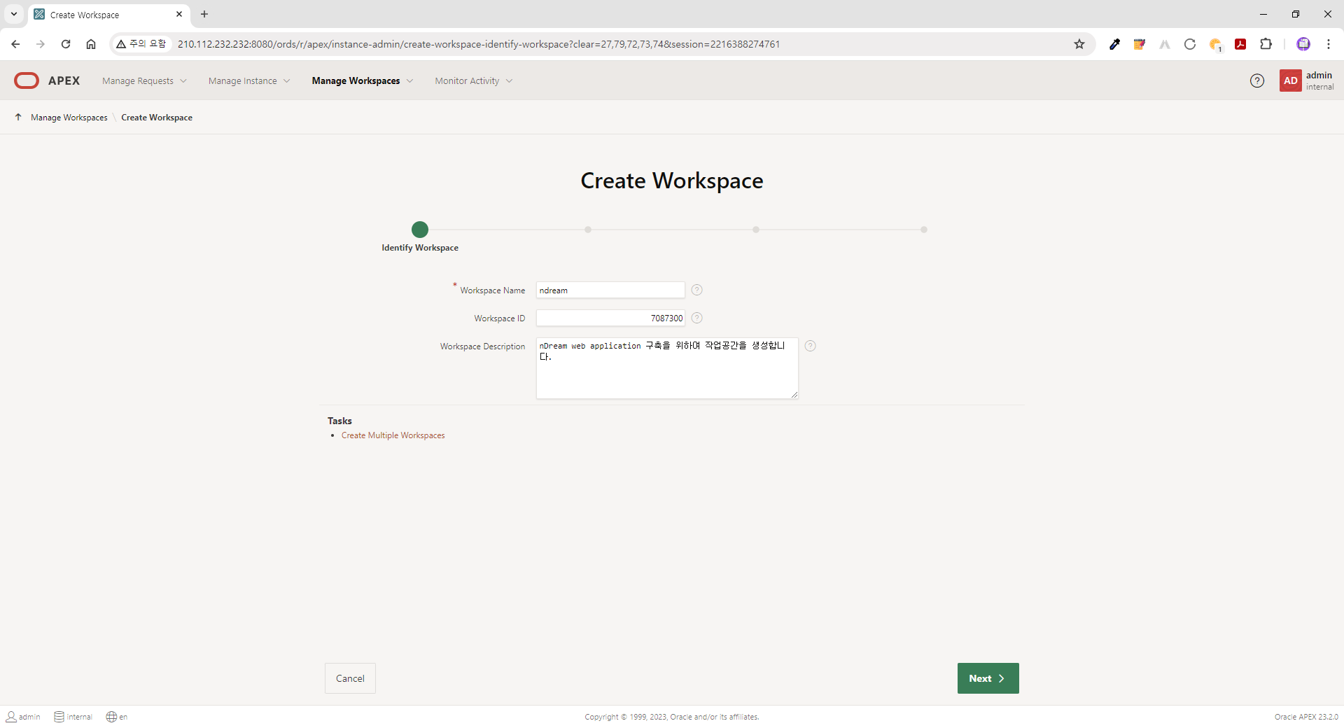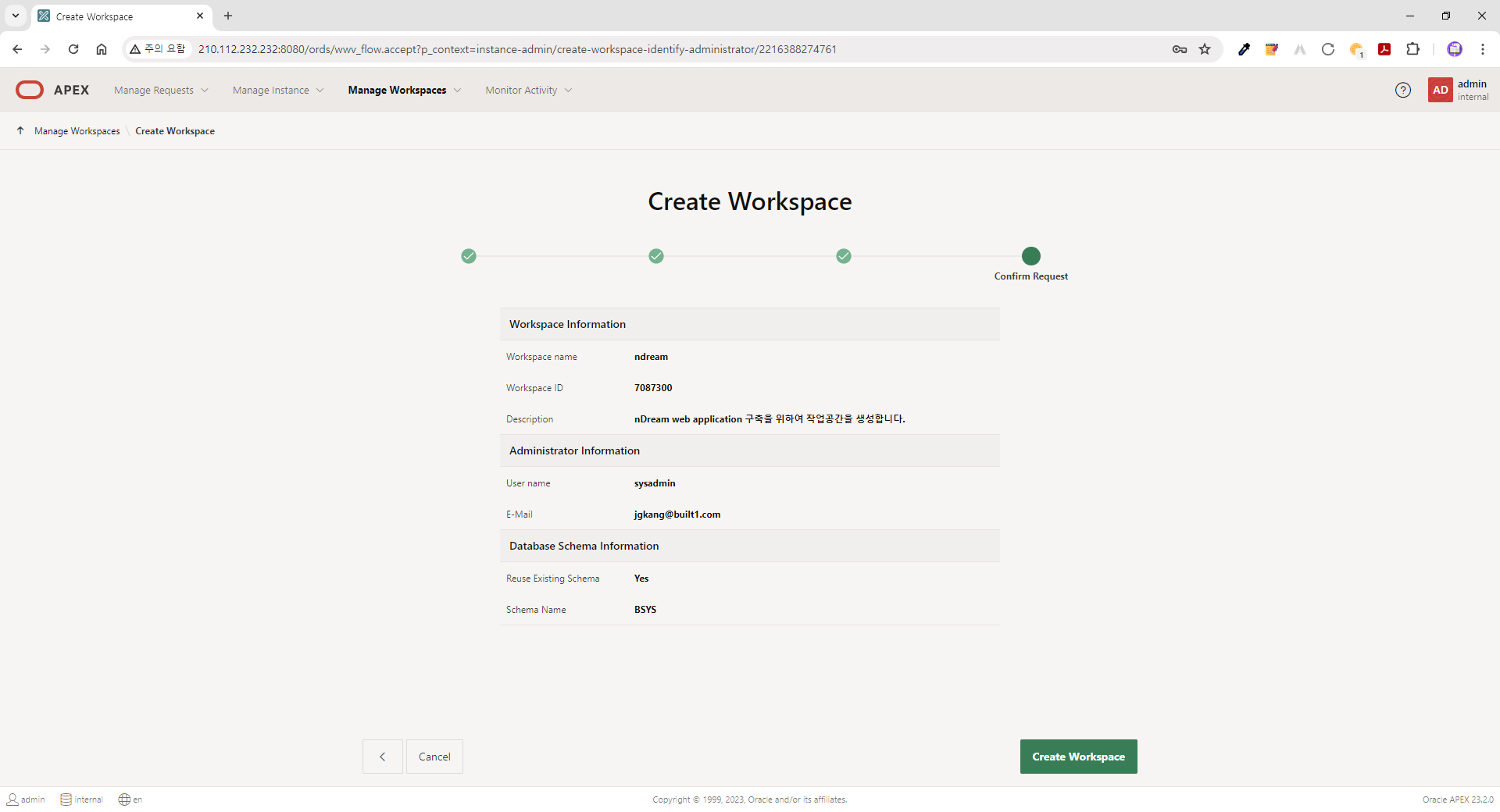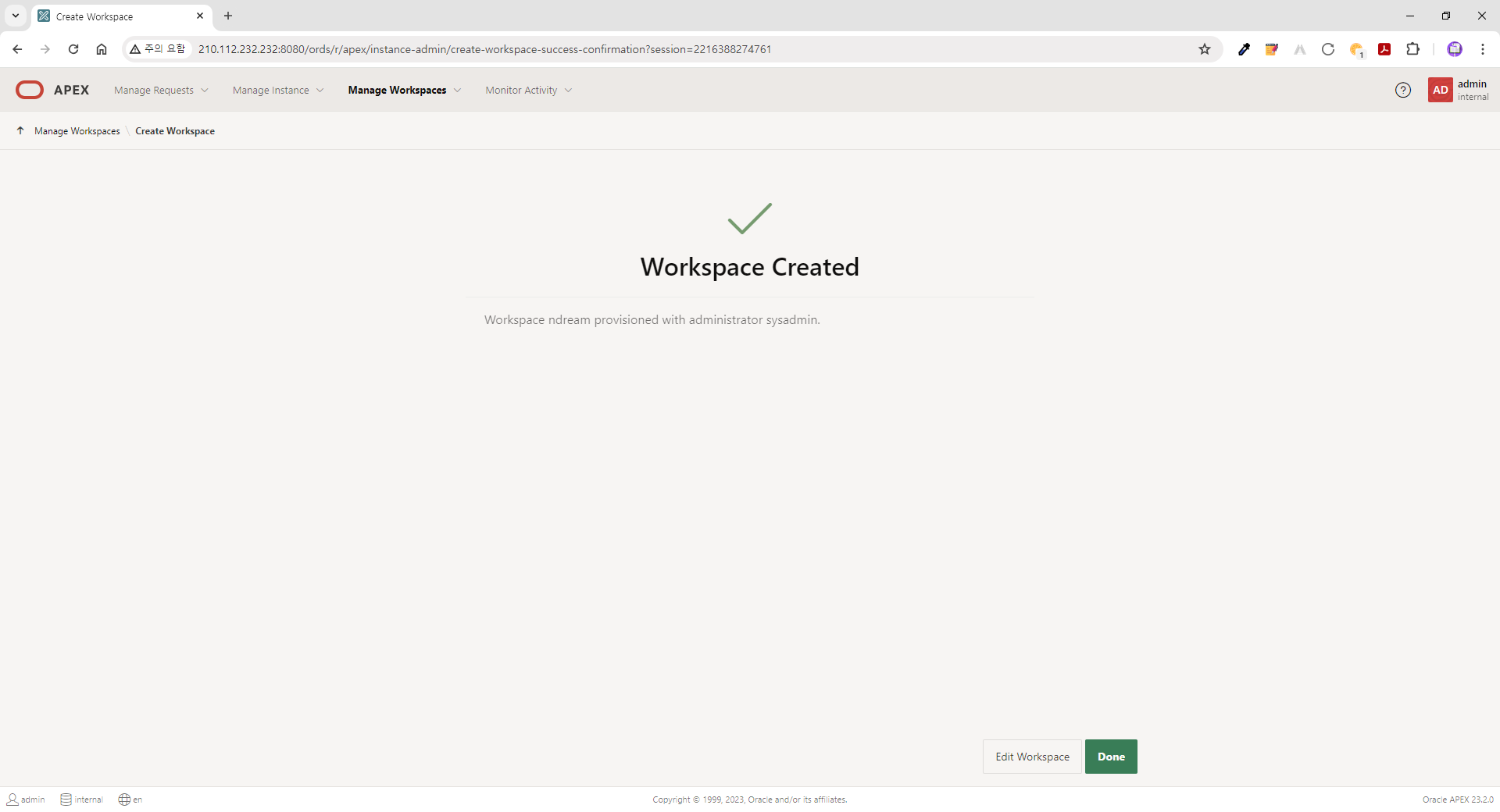 | ● 접속정보 (APEX 23.2) - URL: http://210.112.232.232:8080/ords - Workspace: internal - User Name: admin - Password: B*******$ |