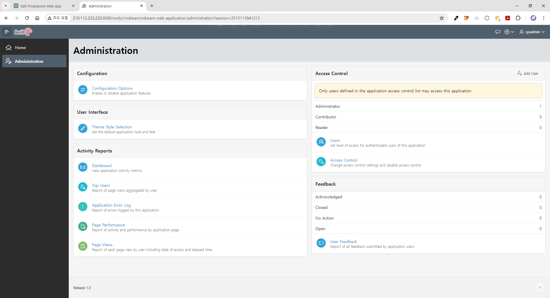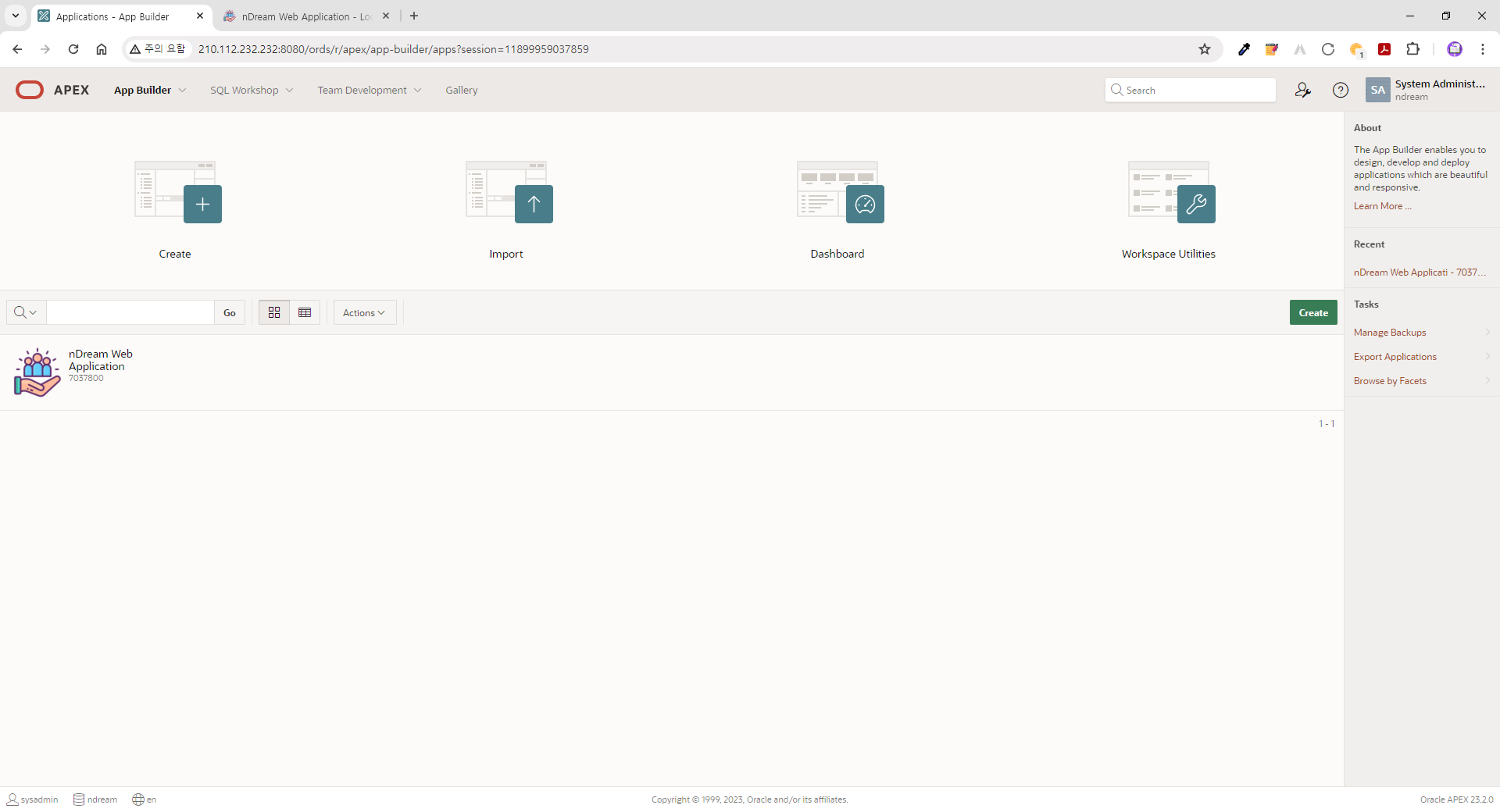| 신규로 생성한 애플리케이션에 대한 설정을 위하여 "nDream web application" 버튼을 클릭합니다. |