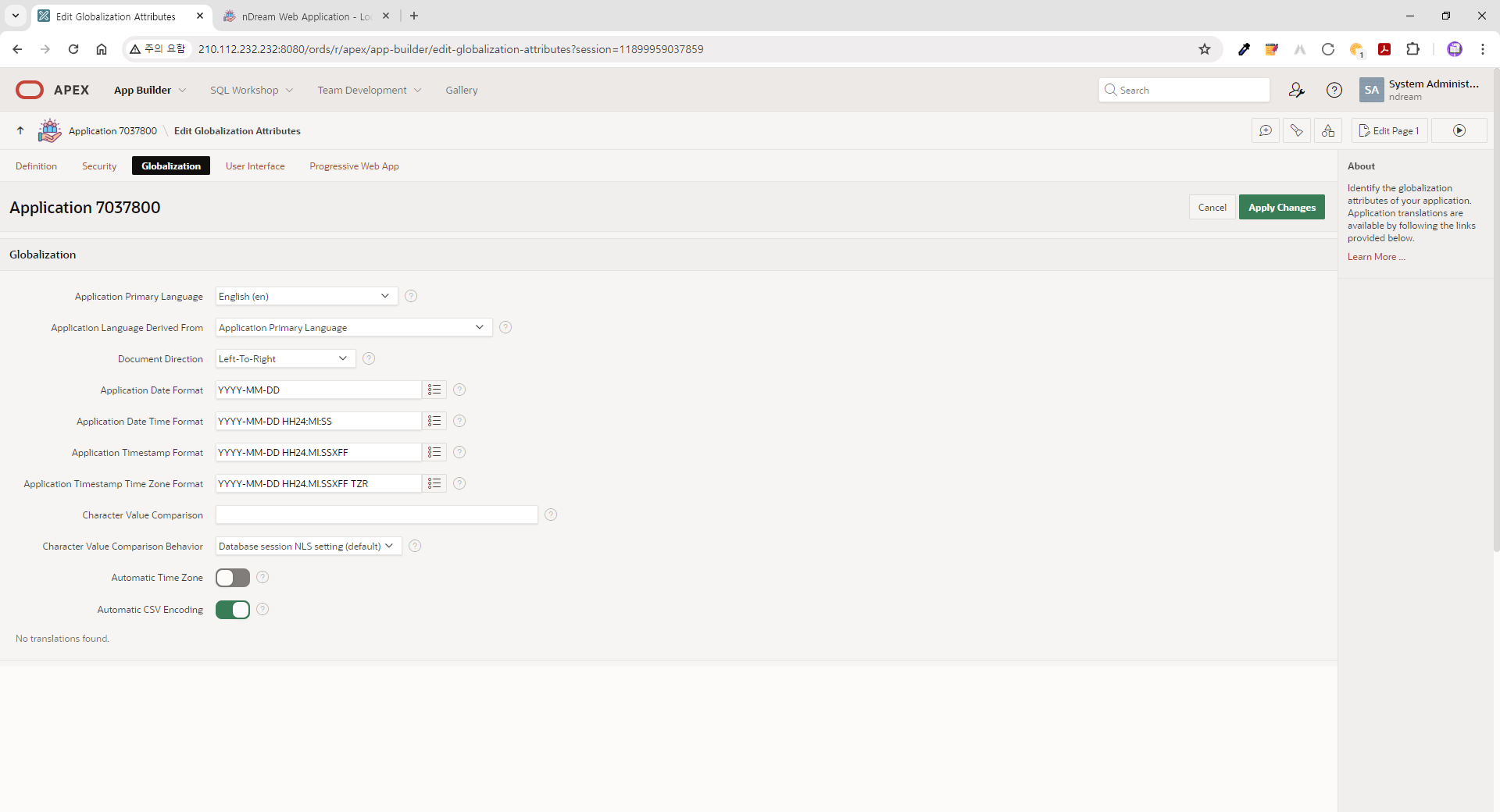 | ● Globalization 탭 페이지 - Application Date Format: YYYY-MM-DD - Application Date Time Format: YYYY-MM-DD HH24:MI:SS - Application Timestamp Format: YYYY-MM-DD HH24.MI.SSXFF - Application Timestamp Time Zone Format: YYYY-MM-DD HH.MI.SSXFF PM TZR |