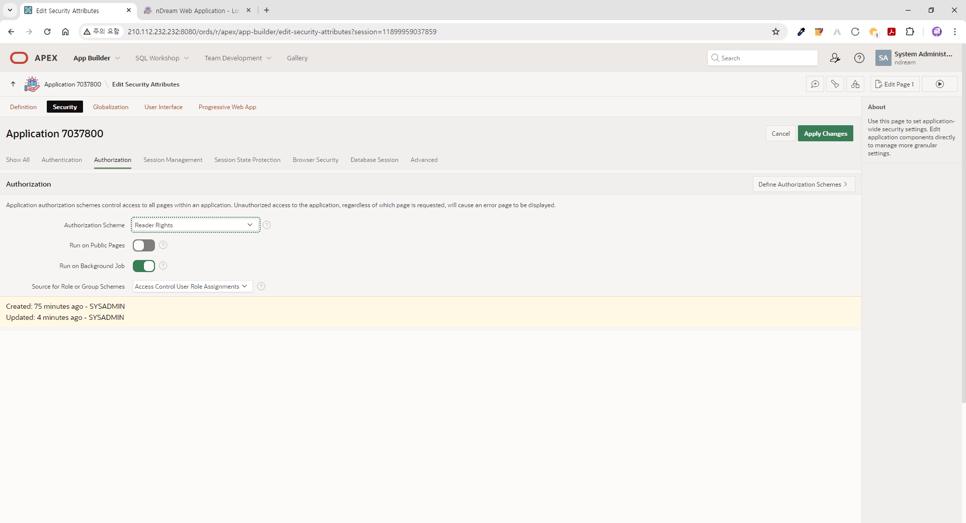 | ● Security > Authorization 탭 페이지 - Authorization Scheme: nDream Auth - Run on Public Pages: No - Run on Background Job: Yes - Source for Role or Group Schemes: Custom Code |