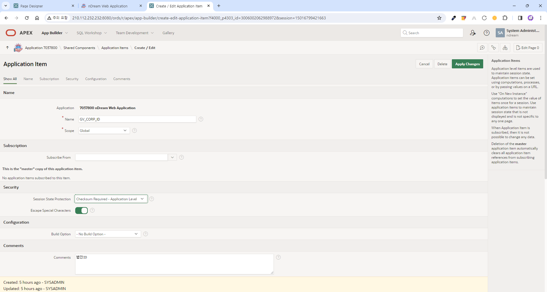 | ● Name - Name: GV_CORP_ID - Scope: Global ● Security - Session Status Protection: Checksum Required - Application Level (애플리케이션 레벨에서 허용) ● Comments - Comments: 법인ID |